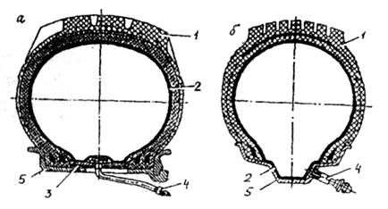 Рис. 1. Камерные шины грузовых (а) и легковых автомобилей (б) (разрез): I -покрышка; 2 - ездовая камера. 3 - ободная лента; 4 - вентиль; 5 - обод.