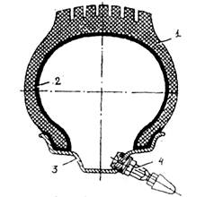 Рис. 2. Бескамерная шина (разрез): 1 - покрышка; 2 - герметизирующий слой; 3 - обод; 4 - вентиль.