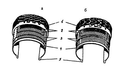 Рис. 3. Покрышки диагональной (а) и радиальной (б) конструкции (разрез): 1 - протектор; 2 - слой брекера; 3 - слой каркаса; 4 - резиновая прослойка каркаса; 5 - бортовая часть.