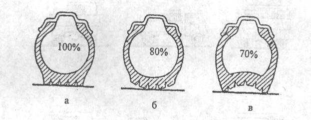 - с кольцевым разрушением или изломом внутренних слоев каркаса, а также с видимыми дефектами, вызванными чрезмерной нагрузкой нитей корда (с их отслаиванием на внутренней поверхности покрышки);