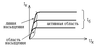 Для рисунка 1.38, б) только для тока Iб3 и больших значений Iб возможно состояние насыщения (точка 2 и другие для больших Iб). Для меньших Iб (Iб1, Iб2) состояние насыщения невозможно, так как нет точки пересечения этих характеристик с нагрузочной прямой на линии насыщения.
