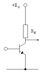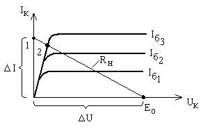 На семействе рисунка 1.38,б) нагрузка Rн изображена в виде прямой Rн.Точка E0 это напряжение питания, центр вращения нагрузочной прямой Rн, которая всегда проходит через E0. Если транзистор заперт (закрыт), то рабочая точка почти совпадает с E0, говорят, что имеет место «отсечка» - закрытое состояние. Точку 1 находят по цифре E0: Rн, т.е. отношение отрезков на горизонтальной оси ∆U и вертикальной ∆I, отсекаемых нагрузочной прямой, определяет цифру Rн