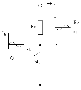Первый полупериод базового тока (биполярные транзисторы управляются током, в отличие от полевых транзисторов, которые управляются напряжением) в положительной области приоткрывает транзистор (так как базовый ток в активной области возрастает), следовательно, падение напряжения на уменьшившемся сопротивлении транзистора убывает, а на резисторе Rк – возрастает (при постоянном E0). Поэтому полупериод на выходе транзистора убывает, напряжение в области уменьшения, инверсия и т.д.
