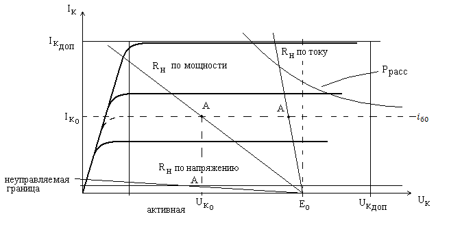 Слева на рисунке 1.42 проводят прямую, отсекающую существенную кривизну характеристик. Сверху и справа проводят границы Iдоп и Uдоп из справочников или каталогов. Снизу – линия неуправляемой границы – ток транзистора при Iб=0 и наибольшей температуре. Справа в боковой части гипербола рассеивания Pрасс. Затем откладывают точку E0 и через нее проводят нагрузочную прямую. Если необходимо наибольшее усиление по току, то прямая Rн ближе к вертикали, проведенной через точку E0 в виде штриховой линии, с наклоном влево (Rн по току). При необходимости усиления мощности проводят Rн по мощности так, чтобы произведение проекций на горизонтальную и вертикальную оси было наибольшим. Для усиления напряжения Rн должна располагаться ближе к горизонтальной оси. Небольшие ошибки, при проведении нагрузочных прямых неизбежны, называют инженерными погрешностями. Затем примерно на середине нагрузочных прямых ставят рабочую точку А. Она определяет ток базы режима ожидания iбо, ток транзистора Iко, и напряжение режима ожидания Uко. Эти параметры обязательно надо установить в режиме ожидания усиливаемого сигнала, после этого можно подавать усиливаемый сигнал на базу и снимать усиленный сигнал с коллекторного электрода. Все процессы должны быть в пределах рабочей области.