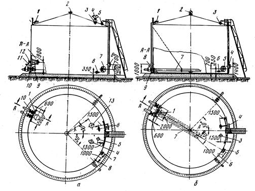 а –для хранения маловязких нефтепродуктов: 1 – верхний световой люк, г –вентиляционный патрубок, з – огневой предохранитель, 4 –основной механический дыхательный клапан, 5 –замерный люк, б – уровнемер, 7 – нижний люк-лаз, в – водоспускной кран, 9 – хлопушка, 10 –грузовой патрубок, 11 –перепускное устройство, 12 –подъемник хлопушки, 13 –предохранительный гидравлический дыхательный клапан; б – для хранения высоковязких нефтепродуктов: 1 –верхний световой люк, 2 – вентиляционный патрубок, 3 –замерный люк, 4 – уровнемер, 5 –нижний люк-лаз, б – водоспускной кран, 7 – шарнирная подъемная труба, 8 –перепускное устройство, 9 –грузовой патрубок.