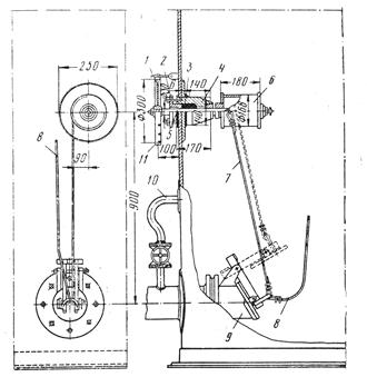 1 –стопор хлопушки; 2 – втулка сальника; 3 –сальниковая набивка; 4 – корпус сальника; 5 –вал подъемника; б – барабан; 7 – трос подъемника; 8 –запасной трос к крышке светового люка; 9 – хлопушка; 10 –перепускное устройство; 11 –штурвал.