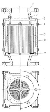 На рис. 7.13 изображен стандартный огневой предохранитель с круглой фольговой кассетой, состоящей из свитых в спираль гофрированной и плоской лент из алюминиевой фольги, образующих несколько параллельных каналов. Эти заградители пламени обладают малым гидравлическим сопротивлением роп инаиболее устойчивы против обледенения.