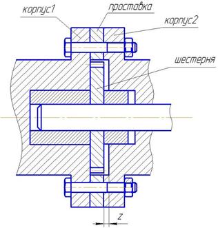 У топливного шестереночного насоса корпус 1 и 2 через проставку стянуты болтами, при стяжки болтов необходимо обеспечить величину осевого зазора между шестерней и корпусом. Решение линейной размерной цепи в которую входит толщина шестерни и толщина проставки не приводит к желаемому результату, т.к. при стягивании корпус и проставка деформируются под действием усилия затяжки болтов, в результате величина зазора уменьшается на величину деформированного сжатия в проставке.