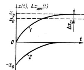 Поясним это на примере. Для измерения постоянной температуры некоторой среды в эту среду вносят термочувствительный измерительный преобразователь, являющийся составной частью используемого средства измерений температуры. Вследствие тепловой инерции термочувствительный преобразователь не сможет сразу принять температуру окружающей среды, а будет постепенно прогреваться до этой температуры. Допустим, что процесс прогрева происходит по экспоненциальному закону. Тогда показания х средства измерений будут изменяться по такому же закону (кривая 1 на рис1). т.е. x{t)=xy(1-e-1/T),