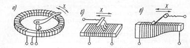 Рис. 11-5. Реостатные преобразователи для угловых (а), линейных (б) перемещений и для функционального преобразования линейных перемещений (в)