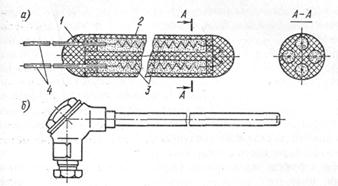 На рис. 11-7, а показано устройство платинового терморезистора. В каналах керамической трубки 2 расположены две (или четыре) секции спирали 3 из платиновой проволоки, соединенные между собой последовательно. К концам спирали припаивают выводы 4, используемые для включения терморезистора в измерительную цепь. Крепление выводов и герметизацию керамической трубки производят глазурью /. Каналы трубки засыпают порошком безводного оксида алюминия, выполняющим роль изолятора и фиксатора спирали. Порошок безводного оксида алюминия, имеющий высокую теплопроводность и малую теплоемкость, обеспечивает хорошую передачу теплоты и малую инерционность терморезистора. Для защиты терморезистора от механических и химических воздействий внешней среды его помещают в защитную арматуру (рис. 11-7, б) из нержавеющей стали.