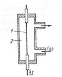 Преобразователь, применяемый в лабораторных условиях для измерения концентрации, представляет собой сосуд с двумя электродами (электролитическая ячейка) (рис. 11-11). Для промышленных непрерывных измерений преобразователи выполняют проточными, причем часто используют конструкции, в которых роль второго электрода играют стенки сосуда (металлические).