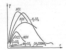 Рис. 11-10. Зависимость удельной электрической проводимости растворов электролитов от концентрации растворенного вещества