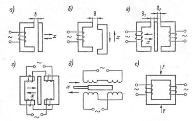 Рис. 11-13. Индуктивные преобразователи с изменяющейся длиной зазора (а), с изменяющимся сечением зазора (б), дифференциальный (в), дифференциальный трансформаторный (г), дифференциальный трансформаторный с разомкнутой магнитной цепью (д) магнитоупругий (е)