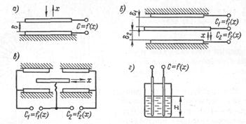 Рис. 11-15. Емкостные преобразователи с изменяющимся расстоянием между пластинами (а), дифференциальный (б), дифференциальный с переменной активной площадью пластин (в) и с изменяющейся диэлектрической проницаемостью среды между пластинами (г)