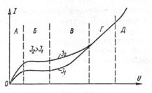 Для измерения степени ионизации используют преобразователи — ионизационные камеры и ионизационные счетчики, действие которых соответствует различным участкам вольт-амперной характеристики газового промежутка между двумя электродами. На рис. 11-17 показана зависимость тока в камере (рис. 11-16) с постоянным составом газа от приложенного напряжения U и интенсивности излучения. На участке А характеристики ток увеличивается прямо пропорционально напряжению, затем рост его замедляется и на участке Б достигает насыщения. Это указывает на то, что все ионы, образующиеся в камере, достигают электродов. На участке В ионизационный ток снова начинает расти, что вызывается вторичной ионизацией при ударениях первичных электронов и ионов о нейтральные молекулы. При дальнейшем увеличении напряжения (участок Г) ионизационный ток перестает зависеть от первоначальной ионизации и наступает