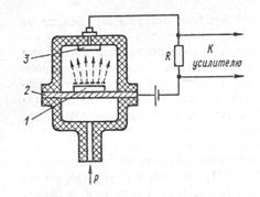 На рис. 11-18 в качестве примера показан ионизационный мембранный манометр, где / —излучатель; 2 — мембрана; 3 — неподвижный электрод, изолированный от мембраны. Между электродами 2 а 3 приложена разность потенциалов, достаточная для достижения тока насыщения. При изменении давления р мембрана прогибается, изменяя расстояние между электродами и значение ионизационного тока.