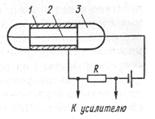 Для регистрации отдельных частиц, а также измерения небольших у-излучений широко применяют так называемые газоразрядные счетчики, действие которых описывают участки В и Г вольт-амперной характеристики. Устройство газоразрядного счетчика показано на рис. 11-19. Счетчик состоит из металлического цилиндра /, внутри которого натянута тонкая вольфрамовая проволока 2. Оба эти электрода помещены в стеклянный цилиндр 3 с инертным газом. При ионизации газа в цепи счетчика появляются импульсы тока, число которых подсчитывается.