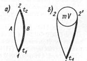 При разности температур точек / и 2 соединения двух разнородных проводников А и В (рис. 11-20, а), образующих термопару, в цепи термопары возникает термо-ЭДС.