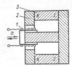 На рис. 11-21 показан индукционный преобразователь для измерения амплитуды, скорости и ускорения возвратно-поступательного движения. Преобразователь представляет собой цилиндрическую катушку /, перемещающуюся в кольцевом зазоре магнитопровода 2. Цилиндрический постоянный магнит 3 создает в кольцевом зазоре постоянное радиальное магнитное поле. Катушка при перемещении пересекает силовые линии магнитного поля, и в ней возникает ЭДС, пропорциональная скорости перемещения.
