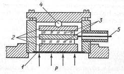 Шарик 4 способствует равномерному распределению давления по поверхности кварцевых пластинок. Средняя прокладка соединена с выводом 5, проходящим через втулку из хорошего изоляционного материала. При воздействии давления р между выводом 5 и корпусом преобразователя возникает разность потенциалов.