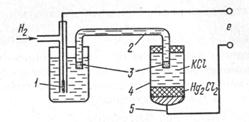 В исследуемый раствор погружен водородный электрод. Оба полуэлемента соединены электролитическим ключом, представляющим собой трубку 2, обычно заполненную насыщенным раствором КС1 и закрытую полупроницаемыми пробками 3. ЭДС такого преобразователя является функцией рН.