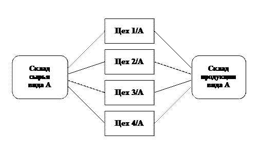 Всего может быть до четырех цехов по производству продукции каждого вида. Все эти цеха используют единый склад сырья соответствующего вида и отгружают произведенную продукцию также на единый склад. Иллюстрацией служит рис. 1.1.
