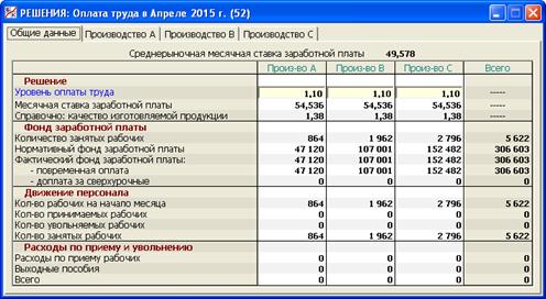 Чтобы не вынуждать пользователя постоянно заниматься пересмотром заработной платы рабочих в абсолютном выражении, в игре предусмотрено, что управленческим решением является уровень оплаты труда относительно указанной среднерыночной ставки. Например, уровень оплаты труда, равный 1,05, означает, что месячная ставка заработной платы рабочих Предприятия на 5% превышает среднерыночную ставку, автоматически увеличиваясь вслед за ростом последней.