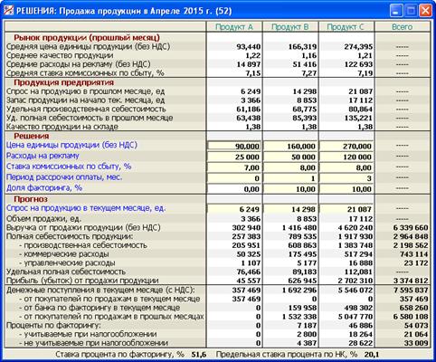 В данном разделе пользователь ежемесячно принимает (корректирует) решения по всем этим факторам, кроме качества продукции, которое уже определилось под воздействием других решений в прошлом и более ранних месяцах (см. п. 2.5).