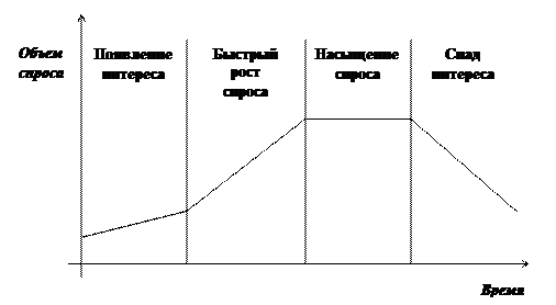 Еще один важный элемент модели рынка заключается в том, что емкость рынка, т.е. тот «пирог», который делят между собой конкуренты, изменяется по ходу игры. Согласно общей теории маркетинга [3, 9, 13], отношение к любому продукту со стороны потребителей последовательно проходит следующие стадии: