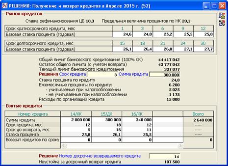 Следует иметь в виду, что текущий лимит может изменяться в результате пересмотра пользователем решений в других разделах программы. Поэтому рекомендуется принимать решение о взятии кредита в последнюю очередь, после принятия всех остальных решений.