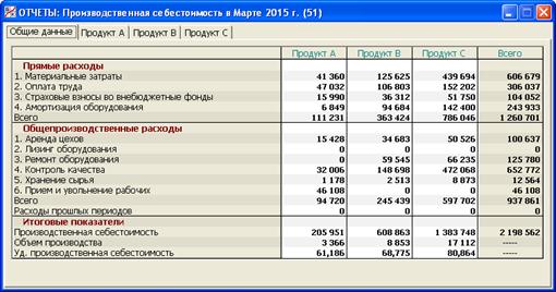В данном разделе программы (рис. 5.7) приводится управленческий отчет о расходах, связанных с производством продукции в отчетном месяце. Общая сумма таких расходов называется производственной себестоимостью продукции.