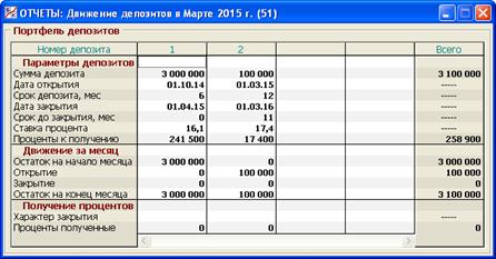 В данном разделе программы (рис. 5.28) приводится управленческий отчет о движении банковских депозитов за отчетный месяц и полученных по ним процентах.