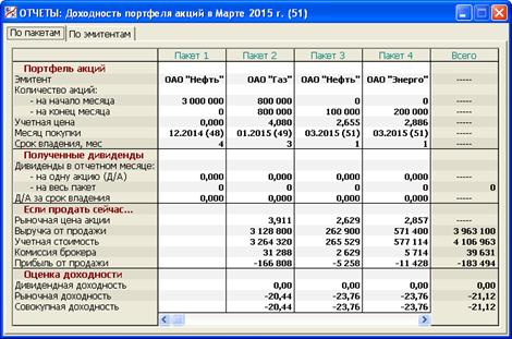 Заметим также, что если в отчетном месяце какой-либо пакет был полностью или частично продан, то фактическая (уже не оценочная) доходность проданных акций рассчитывается в разделе «Отчеты/Продажа акций других организаций» (п. 5.19), причем способ расчета аналогичен. Представленные там показатели будут заведомо отличаться от показателей настоящего раздела, так как в срок владения проданными акциями отчетный месяц уже не включается.