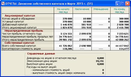 В данном разделе программы (рис. 5.36) приводится управленческий отчет о структуре и динамике собственного капитала Предприятия за отчетный месяц, а также данные об акциях Предприятия и выплаченных дивидендах.