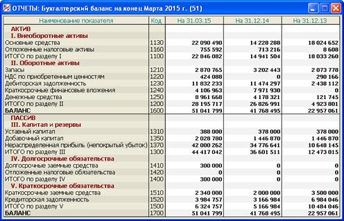 В данном разделе программы (рис. 6.2) приводится Бухгалтерский баланс, который показывает финансовое состояние организации на отчетную дату, причем для сопоставления приводятся аналогичные данные на последние даты двух предыдущих лет.