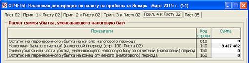 В данной программе эта проблема решается следующим образом: при реформации баланса на очередной календарный год (см. п. 6.1) указанная сумма отражается по дебету забалансового счета Н/УБ/ОБЩ «Общие убытки от деятельности – входящее сальдо» и кредиту вспомогательного счета Н/0. Данные счета Н/УБ/ОБЩ и показываются по строке 010 «Остаток не перенесенного убытка на начало налогового периода» в течение всех отчетных периодов текущего года. Строка 140 «Налоговая база за отчетный (налоговый) период» полагается равной строке 100 Листа 02, если эта строка положительна, и нулю – в противном случае. Строка 150 «Сумма убытка или части убытка, уменьшающего налоговую базу за отчетный (налоговый) период» рассчитывается как минимум из значений строк 010 и 140. Значение этой строки показывается в строке 110 Листа 02. Строка 160 «Остаток не перенесенного убытка на конец отчетного (налогового) периода» рассчитывается как разница строк 010 и 150, если строка 100 Листа 02 положительна, а в противном случае – как сумма строки 010 и абсолютной величины строки 100 Листа 02. Иными словами, в этом случае к убытку на начало года добавляется сумма убытка, полученного в отчетном (налоговом) периоде.