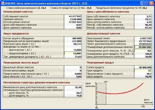 Особенность обсуждаемого раздела состоит в том, что исследование проблемы финансирования проводится здесь в интерактивном режиме. Пользователь вводит требуемый объем дополнительного капитала, указывает его структуру и некоторые другие параметры, а программа автоматически рассчитывает: