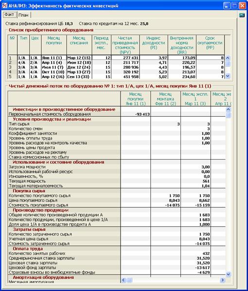 Подчеркнем, что на закладке «План» воспроизводятся данные Планового раздела в месяце покупки выбранного оборудования. Если в этом месяце пользователь не работал с Плановым разделом, то будут показаны установленные там по умолчанию значения. В таком случае закладка «План» является пустой формальностью, поскольку она не отражает целенаправленных действий пользователя по стратегическому финансовому планированию. Поэтому рекомендуем всегда обращаться к Плановому разделу перед тем как приобрести оборудование, особенно дорогостоящее вида В или С.