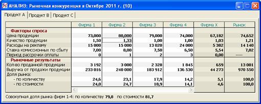 В нижней части окна показана совокупная доля рынка фирм – участниц игры (по количеству и стоимости). Если эта доля превышает 50 %, то, значит, «живые» фирмы, взятые вместе, действуют на рынке лучше, чем скрытые конкуренты, и наоборот.