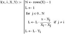 . Аргументы функции: x- координата точки; i - номер многочлена; X - вектор, содержащий координаты узловых точек; Y - вектор, содержащий значения интерполируемой функции в узловых точках