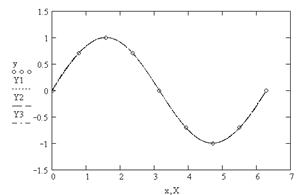 Программа, реализующая метод сплайн-интерполяции оказывается достаточно громоздкой, поэтому мы ограничимся обсуждением решения задачи об интерполяции синуса с помощью сплайнов, используя функции пакета MathCAD: interp (VS,x,y,z), lspline (x,y), pspline (x,y), cspline (x,y).