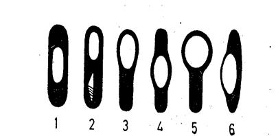 Pис. 11. Типичные формы спорообразующих клеток. 1. Спора расположена в центре; материнская клетка не увеличена (Bacillus megaterium). 2. Спора расположена терминально, материнская клетка не увеличена; заметны белковые включения (Bacillus thuringiensis). 3. Спора расположена терминально, материнская клетка раздута в форме булавы (Bacillus polymyxa). 4. Спора расположена в центре; материнская клетка деформирована и приобрела форму веретена - клостридиальная форма (Bacillus polymyxa). 5. Спора расположена терминально; круглая материнская клетка имеет форму барабанной палочки - плектридиальная форма (Bacillus sphaericus). 6. Спора расположена латерально; материнская клетка приобрела веретенообразную форму (Bacillus laterosporus) (Шлегель Г., 1987).