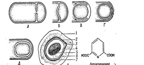 Рис. 12. Схема образования споры. А и Б. Образование септы. В и Г. Окружение протопласта споры протопластом материнской клетки. Д. Образование кортекса и оболочек споры. Е. Схема строения зрелой споры. 1 - экзоспориум; 2 - наружная оболочка споры; 3 - внутренняя оболочка споры; 4 - кортекс; 5 - клеточная стенка зародыша; 6 - цитоплазматическая мембрана; 7 - цитоплазма с ядерным веществом (Шлегель Г., 1987).