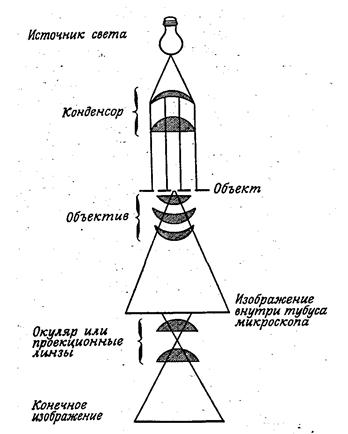Рис. 14. Схема сложного светового микроскопа для наблюдения в светлом поле, отрегулированного для освещения по Келеру (Стейниер Р. и др., 1979).