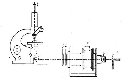Рис. 17. Схематическое изображение флуоресцентного микроскопа: 1. Дуговая лампа; 2. Кварцевый коллектор; 3. Кювета, заполненная раствором сернокислой меди; 4. Передняя часть коллектора; 5. Ультрафиолетовый фильтр; 6. Призма; 7. Пластинка из уранового стекла; 8. Окулярный фильтр, поглощающий ультрафиолетовые лучи (Экспериментальная микробиология, 1965).