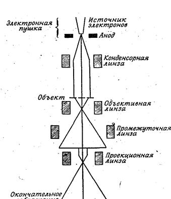 Рис. 18. Схема трансмиссионного электронного микроскопа (Стейниер Р. и др., 1979).