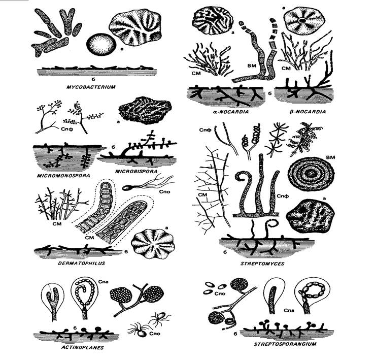 Рис. 19. Микобактерии, нокардии и актиномицеты: а – форма колоний, характерная для данного рода; б – разрез через заросшую бактериями, поверхность агара. Показаны типичные формы роста субстратного мицелия (СМ) и воздушного мицелия (ВМ), спорофоры (Спф) и спорангии (Спа), а также лишенные жгутиков и обладающие жгутиками споры (спо) (Шлегель Г., 1972).