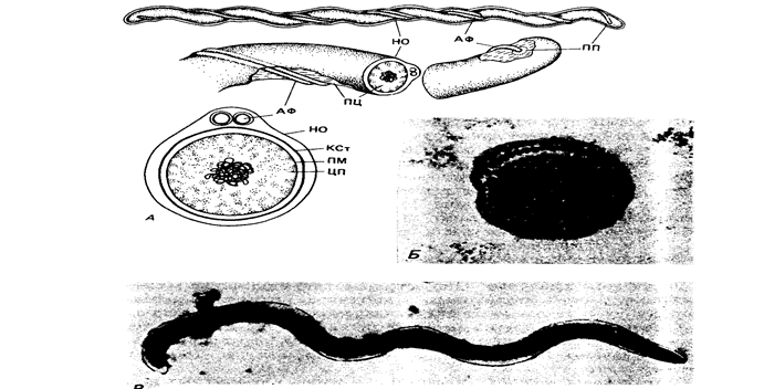 Рис. 20. Клетка спирохеты. А. Протоплазматический цилиндр (ПЦ), обвит аксостилем, состоящим в данном случае из двух осевых фибрилл (АФ), каждая из которых на одном конце прикреплена к протоплазматическому цилиндру (ПП – прикрепительная пора). Фибриллы, идущие от разных концов клетки, перекрываются. Аксостиль и протоплазматический цилиндр окружены наружной оболочкой (НО). КСт – клеточная стенка; ПМ – плазматическая мембрана; ЦП – цитоплазма (Голт С., 1978). Б и В. Электронные микрофотографии поперечного среза (Б, 110 000 х) и всей клетки (В, 7 000 х) спирохеты из ротовой полости с несколькими осевыми фибриллами (Листгартен Г., 1964).