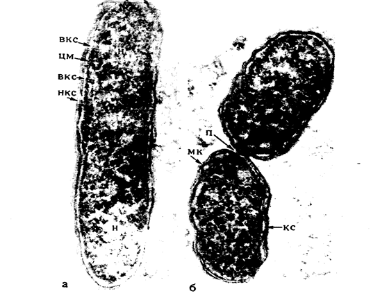 Рис. 23. Rickettsia prowazekii в культуре ткани: а – видны отчетливо внутренний слой (вкс) и наружный слой (нкс) клеточной стенки, представленной трехслойной мембраной, цитоплазматическая мембрана (цм) и ядерное вещество (н); б – видны микрокапсула (мк), клеточная стенка (кс) и перетяжка (п), делящая клетку как у большинства грамотрицательных бактерий. х 72 000, х 108 000 соответственно (Авакян А.А., Кач Л.Н., Павлова И.Б., 1972).